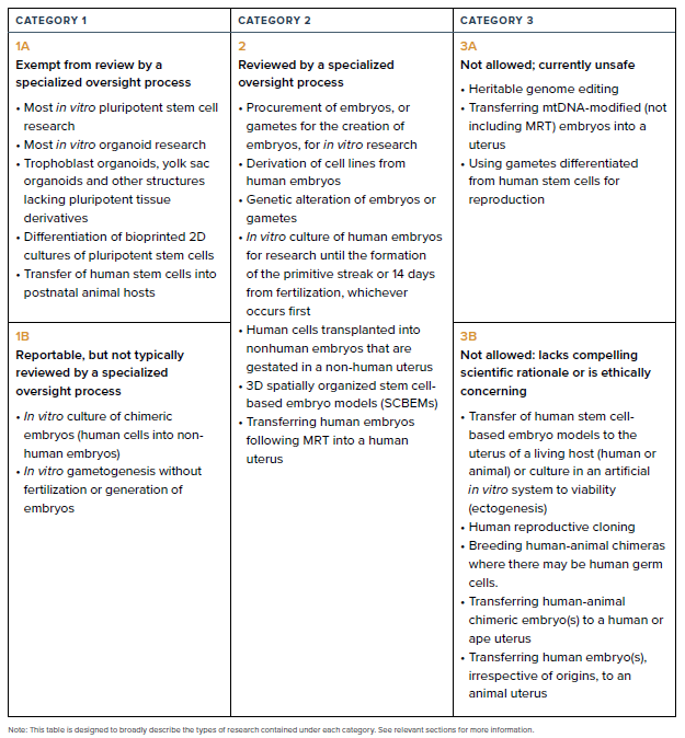 • Recommendation 2.2: To ensure that human embryo and related stem cell research is proceeding with due consideration, to ensure consistency of research practices among scientists globally, and to specify the types of scientific projects that should be subject to review, the research review and oversight process should use the three categories described in this section.